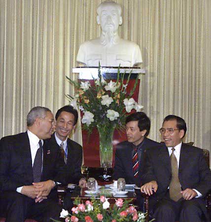 Vietnam's Communist Party Secretary General Nong Duc Manh (R) shares a light moment with visiting U.S. Secretary of State Colin Powell (L) underneath the bust of Ho Chi Minh at the Communist Party headquarters in Hanoi July 26, 2001. Powell, on his first visit in the country since his wartime service, is attending the Association of South East Asian Nations Regional Forum in the Vietnamese capital. (Rathavary Duong/Reuters)